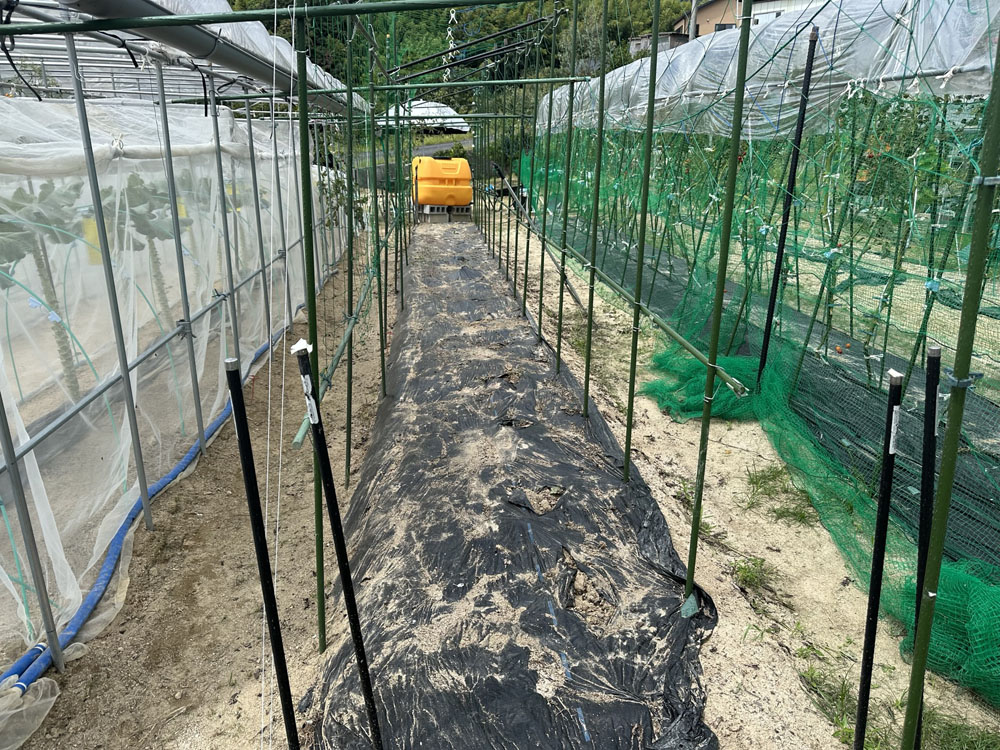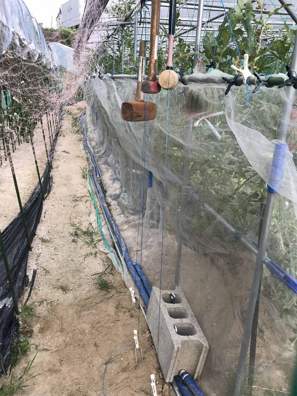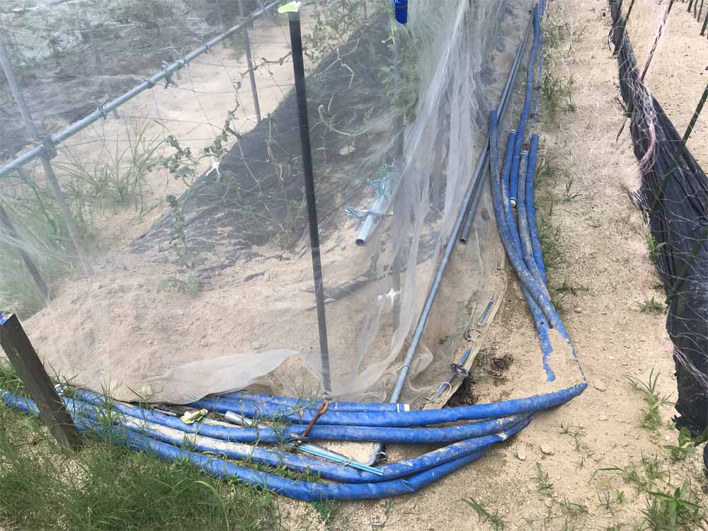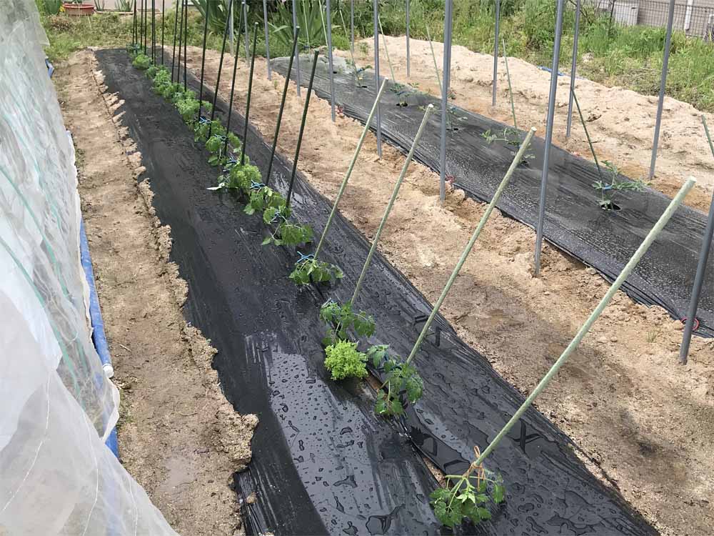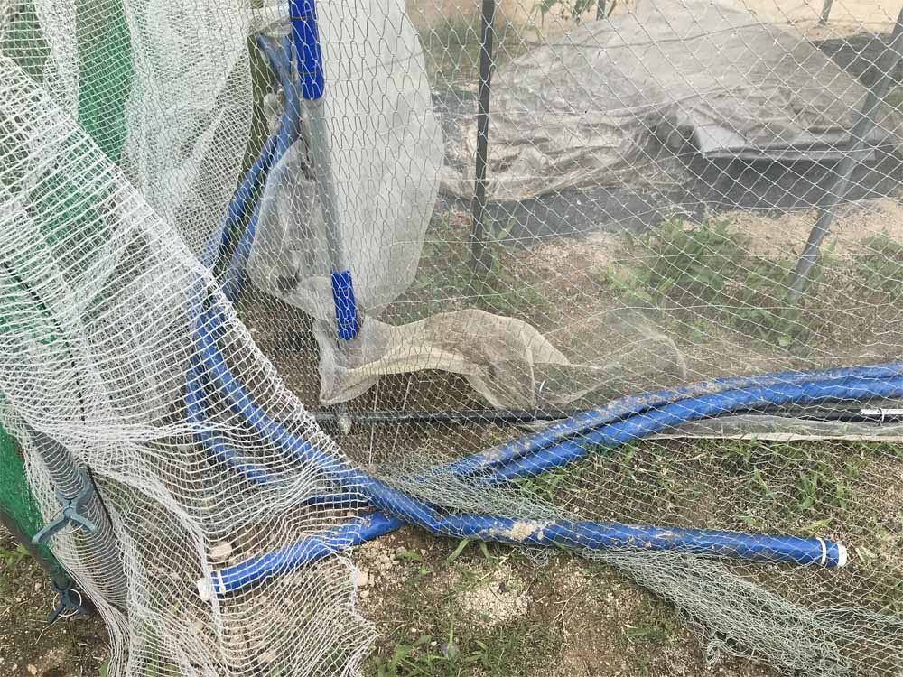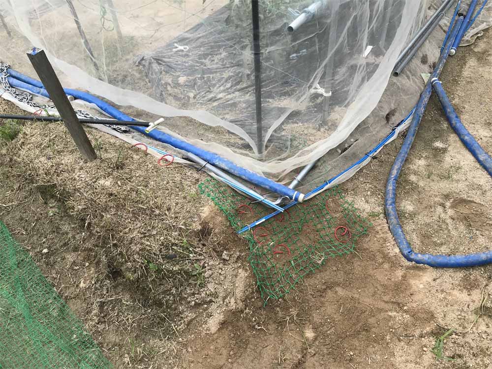 小玉スイカの蔓がネットに誘引出来るくらいに伸びたので、ネットを張って空中栽培の開始です。この畝には21株植えてあります。1株から子蔓を4本誘引します。